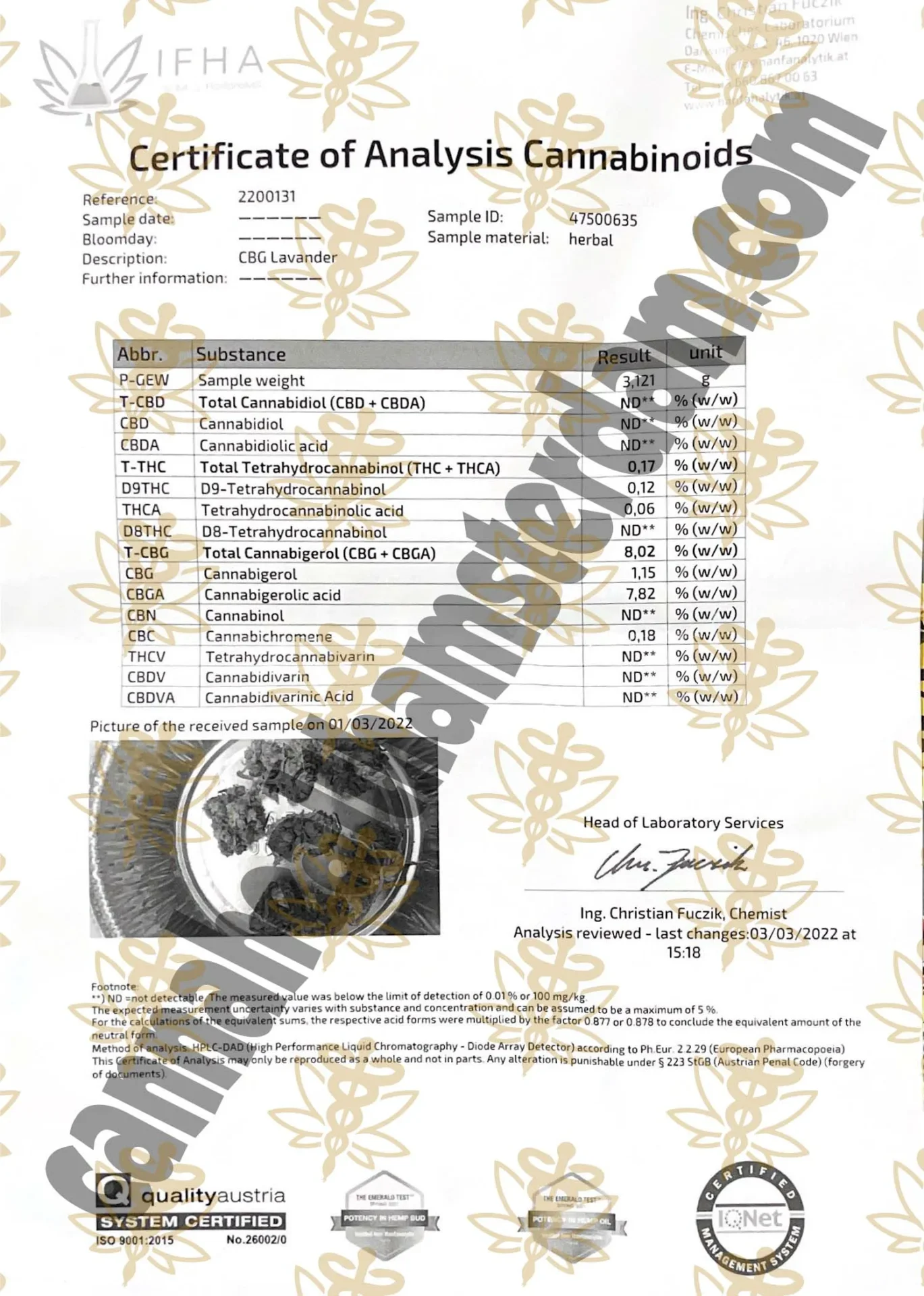 - Περιεκτικότητα σε THC: LOQ (< Όριο ποσοτικού προσδιορισμού) – Μη ψυχοδραστικό