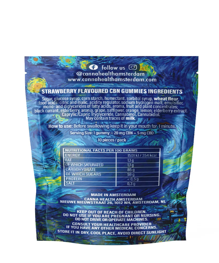 Κάθε συσκευασία των 10 καραμέλων παρασκευάζεται με την ανώτερη διαδικασία εξευγενισμού του CBN της Canna Health Amsterdam, εξασφαλίζοντας καθαρότητα και συνέπεια σε κάθε δόση. Κρατήστε τα στο κομοδίνο σας για μια γλυκιά απόλαυση πριν τον ύπνο ή πάρτε τα μαζί σας όποτε χρειάζεστε μια στιγμή χαλάρωσης.